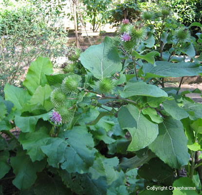 Bardana: Planta medicinal utilizada em uso interno contra a acne e os furúnculos, e em uso externo, no tratamento contra o eczema.É usada popularmenta para tratar sarna, tumores e doenças venéreas É também desinfetante, depurativo, microbicidas, anti-fúngico, drenador, diurético. As partes que podem ser utilizadas são, raiz fresca, folhas secas, brotos.Pode ser usado como banho para os filhos de Exu. seus banhos (do pescoço para baixo) expulsam Eguns.