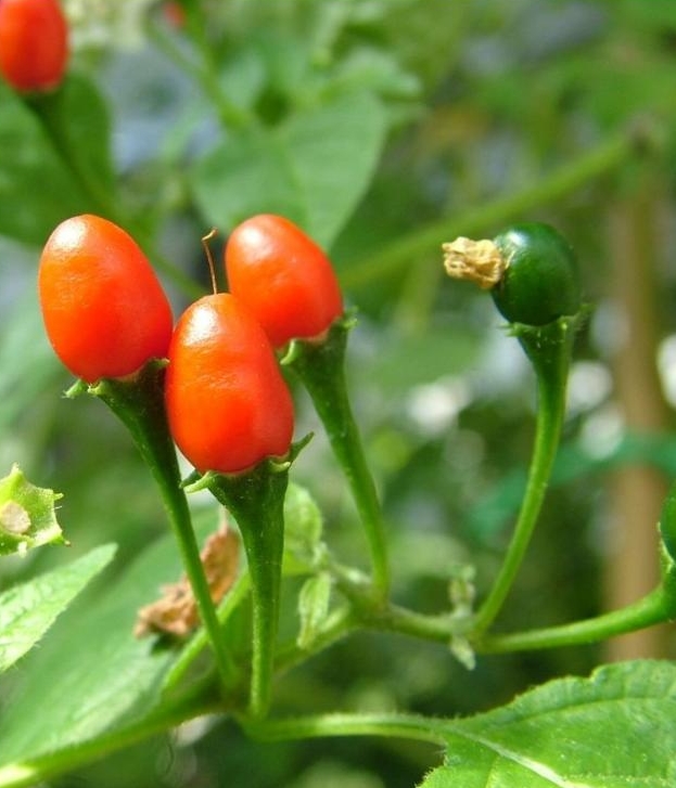 Pimenta Cumari: Chegam a formar verdadeiros arbustos. Os frutos desta pimenta são bem pequenos, arredondados ou ovalados, de coloração vermelha quando maduros. Pode ser colocado em varios pratos de Exu.