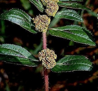 Erva de bicho ou Baleeira: Ideal para tratar problemas como má circulação (pois serve como estimulante da mesma), varizes, infecções urinárias, reumatismo, infecções de pele, queda capilar, dores musculares, entre outros males. Para problemas de pele, feridas, coceiras e furúnculos, é importante não apenas consumir o chá, mas também prepará-lo como pomada e aplicar sobre o local necessitado. Basta colocar em um pano limpo as folhas picadas da erva de bicho, abafá-lo bem e colocá-lo sobre uma peneira que esteja em cima de uma panela com água fervente. As folhas no pano absorverão os vapores, e então deverão aplicadas nas partes afetadas enquanto ainda estão mornas. Deixe assim por 10 minutos, e repita o procedimento diariamente, 2 vezes ao dia, até estar definitivamente curado. A Erva de bicho é utilisada nos ebós contra Eguns e para Assentamento de Exu.