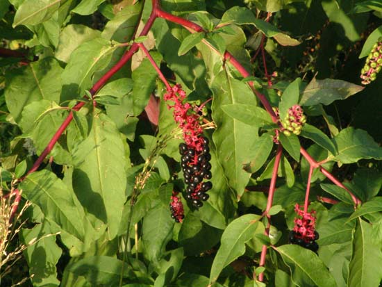 Tintureiro: Também é conhecida como caruruaçi, erva-dos-cachos, erva-de-laca, espinafre-macio, uva do Canadá, tintureira-vulgar, fitolaca americana, uva-turca e uva-dos-passarinhos. Pode ser achada principalmente na região do Nordeste, Sudeste e Sul. A fitolaca é indicada para tratamentos de prisão de ventre, reumatismo e atua como anti-inflamatória, depurativa e antiobesidade. As suas Frutas podem intoxicar uma pessoa adulta. Se acontecer a ingestão da mesma crua, os sintomas são: Diarreia, vômitos, náuseas, espasmo estomacal, tontura e dor de cabeça. Eles podem durar de 24 até 48 horas. Em seu pé são arriadas oferendas para Exu. Também é erva das Yami Oxorongá.